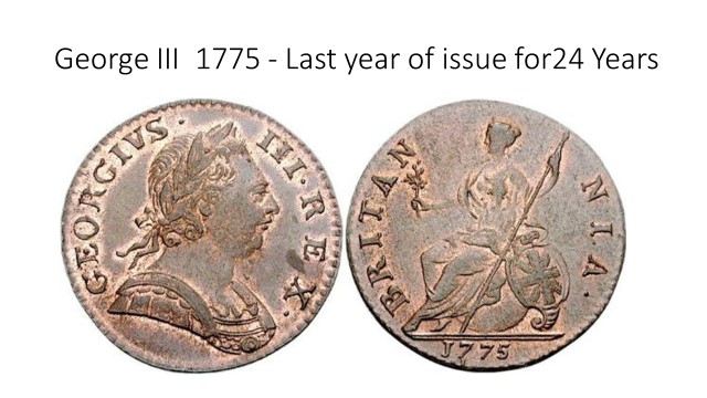Then due to higher copper prices and the significant number of counterfeit coppers in circulation no Regal coppers were produced during twenty four years of the reign of George III (1760-1820) after 1775.