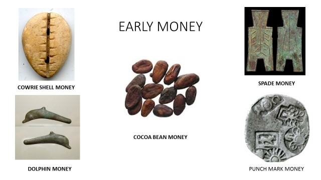 One of the earliest mediums of exchange were sea shells. From 2000BC Cowrie shells were used in China, initially genuine shells then, later, copies in bone and in china. Shells were widely used in other parts of the world.