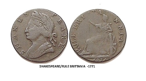 Obv: Bust of William Shakespeare facing left, legend around WARWICKSHIRE. Rev: female figure seated, supporting a cornucopia, bow of ship in background, date in exergue HALFPENNY 1791