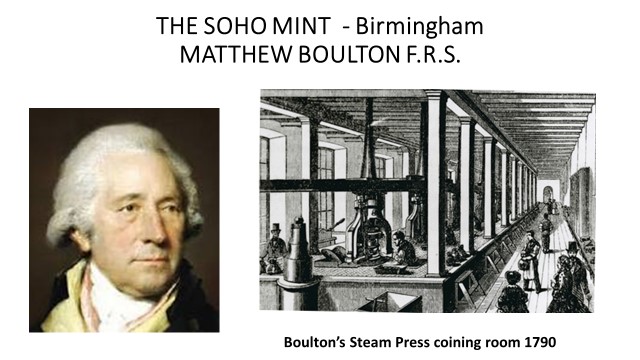 Mathew Boulton had turned his attention to coinage in the mid-1780s as an extension to the small metal products he already manufactured in his factory in Soho Birmingham. In 1788 he established a Mint as part of his industrial plant. He invented a steam driven screw press in the same year