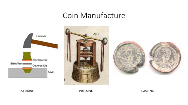 Coins are made by impressing a die onto a blank circular piece of metal usually called a Blank or Flan or Planchet. Impressing was done by impact, as the Romans did, and later, as now, by pressing.