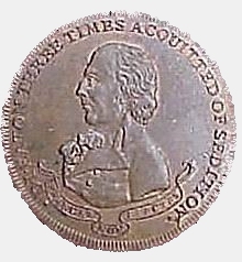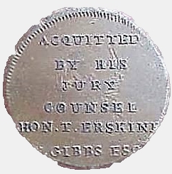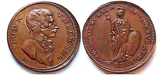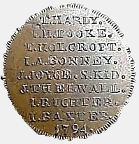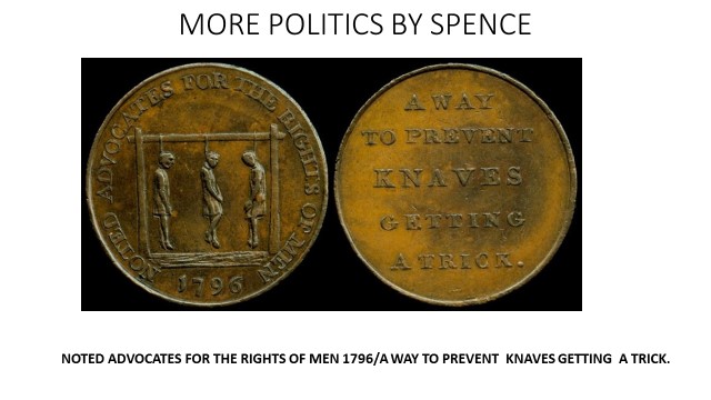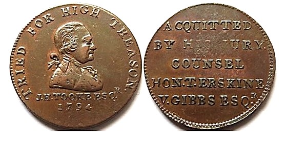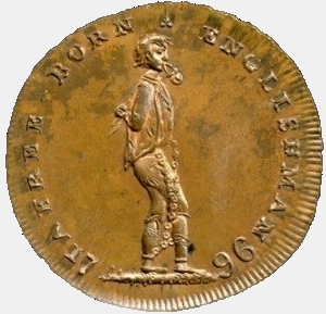 This coin shows Richard Dinmore’s Norwich (Norfolk) copper halfpenny token undated. Dinsmore was a member of the Norwich Patriotic Society , an regional clone of the Corresponding Society. He had a business as a saddler’s ironmonger and hemp merchant at Timber Hall, Norwich.