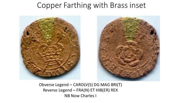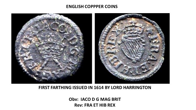 The picture above is of one of the first English copper coins ,a farthing. Engraved – In Latin- James, by the Grace of God King of Great Britain France and Ireland.