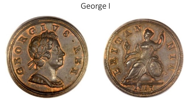 By the reign of the first Hanoverian, George I (1714-1727), there was once again a need for more coppers. In 1717 a royal warrant proclaimed a new halfpenny would be issued by the royal mint.