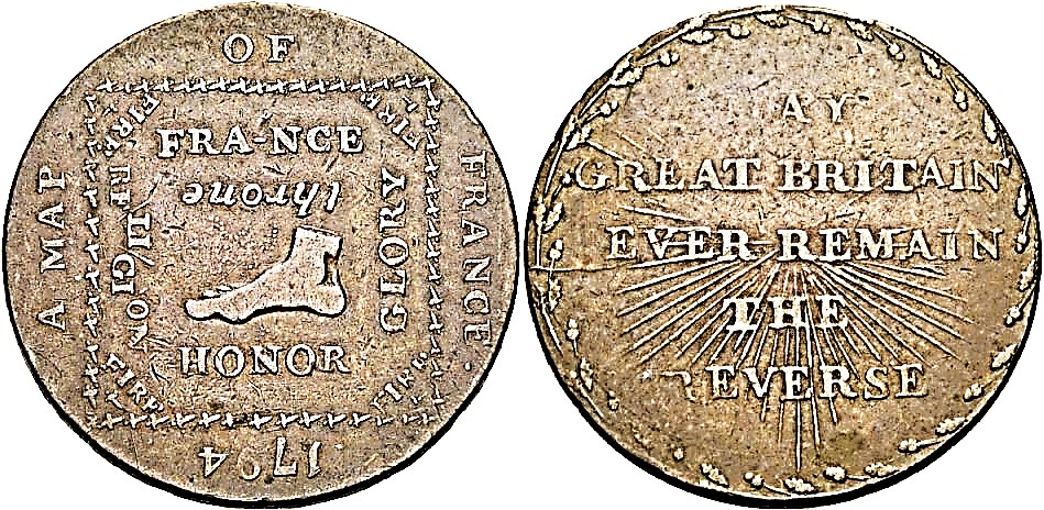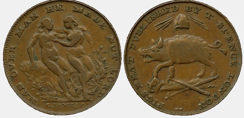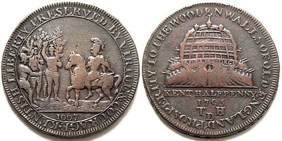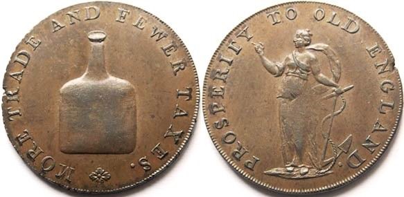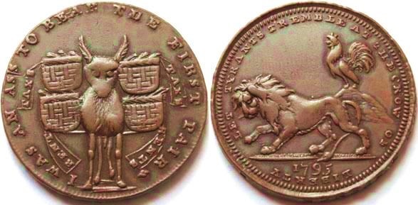 For a ten year period extending from 1787-1797 almost the only “coins” in circulation in Britain had been the Provincial, or tokens. As they were designed and manufactured by the public, they were not limited by any rules or regulations. Taken as a group, the tokens form a history of a people in a way never seen before — or since!! Through them, we can look in on life in late 18th century Britain. We can see how they lived and thought through their commerce, politics, advertising, and even view their architecture.