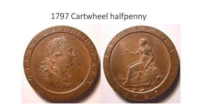 In 1797 George III contracted Matthew Boulton of the Soho mint in Birmingham to produce large two pence and penny coins known as "cartwheels," because of their wide extruding rim. Boulton designed these coins so they would be difficult to counterfeit. Certainly the cost of the copper exceeded the value of the coin so counterfeiters had nothing to gain.