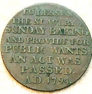 Eighteenth Century Bakers were exempt from Charles II law ( Sunday Observance Act) because their ovens were important for cooking the Sunday meal. This Token was struck to commemorate an act of Parliament which gave relief to overworked apprentice and journeyman bakers by limiting the hours by which the baking and selling of baked goods could take place on a Sunday.