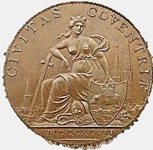 In this other Coventry coin Obverse: Peeping Tom is shown looking out of a building (top left). Memorae Godivae 1757 in exerge.