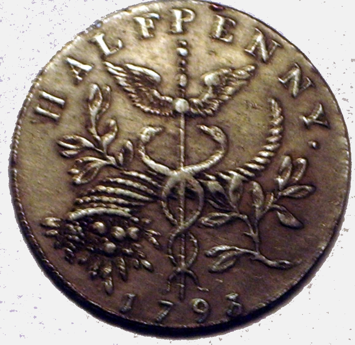 Reverse: Winged caduceus with intertwined serpents, olive branch and cornucopia with legend: “HALFPENNY 1793” The two-snake caduceus design has ancient and consistent associations with trade, eloquence, negotiation, alchemy and wisdom. In addition to being Astronomer Royal and famous scientist, Sir Isaac Newton was also Master of the Royal Mint for a time, then situated in the Tower of London