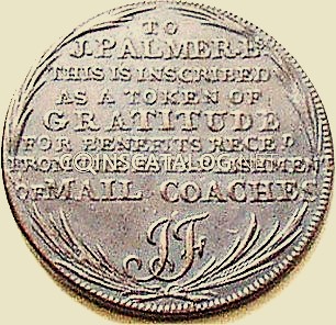 To J.PALMER.Esq THIS IS INSCRIBED AS A TOKEN OF GRATITUDE FOR BENEFITS RECE'D FROM THE ESTABLISHMENT OF MAIL COACHES JF The initials are probably those of James Fittler, who is also known to have engraved a portrait of Palmer.