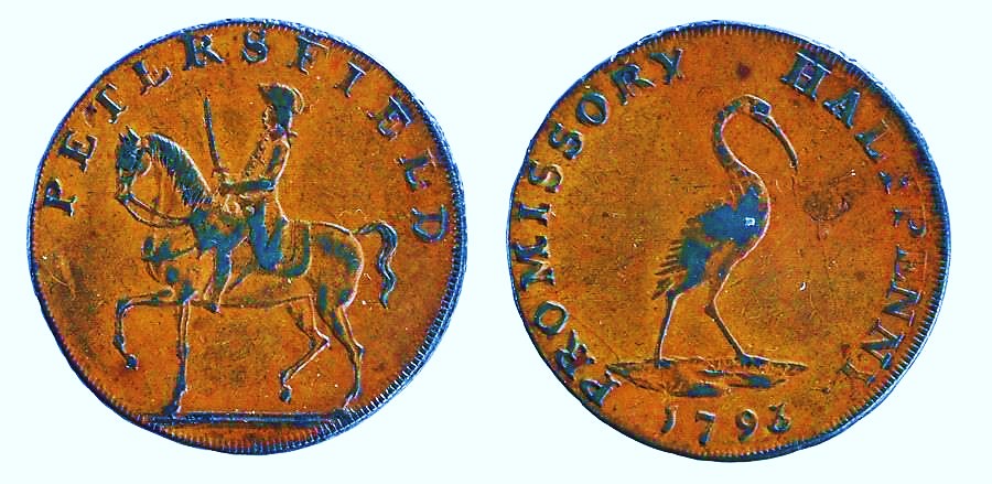 Obverse: Man on horseback,Legend: PETERSFIELD Reverse: Stork, Legend: PROMISSORY HALFPENNY 1793 Edge Legend -Eames,Holland and Andrews Petersfield