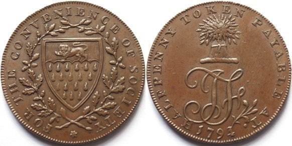 Beginning in 1787, they produced Penny and Halfpenny tokens, of the correct weight, nice design, and an edge legend that stated they were repayable in Regal funds by them. They were keenly accepted by the workers, and welcomed by the merchants.