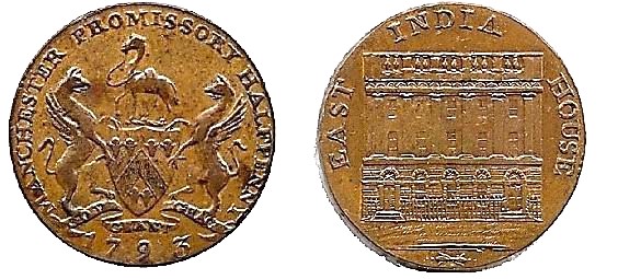 Manchester also turned to this alternative form of making money and promoting trade in the area. From 1792, halfpennies were issued by 'I. Fielding' featuring a fine representation of the Grocers' Arms crest on the obverse. The reverse showed a detailed view of the East India House, possibly to convey the idea that exotic products were now easily available. Manchester was advertising its links to world trade and the Issuer, Fielding was advertising his tea products.