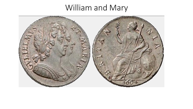 William and Mary displayed both of their profiles on their coins, using the bust facing right for all denominations. After Mary died of smallpox, William III ruled alone (1694-1701).