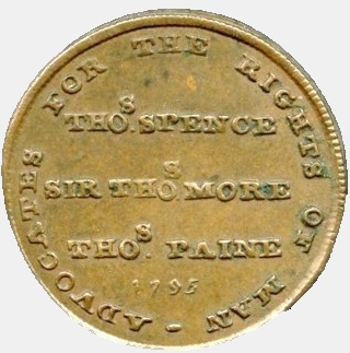 Obverse: Central wheatsheaf, BAKERS HALFPENNY 1795 Reverse:: TO LESSEN THE SLAVERY OF SUNDAY BAKING AND PROVIDE FOR PUBLIC WANTS: AN ACT WAS PASSED. A.D. 1794.