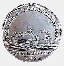 Reverse: Whale fishing scene, four men in a small boat harpooning whales by hand, “PAYABLE AT I FOWLER’s LONDON WHALE FISHERY 1794”. Plain edge.